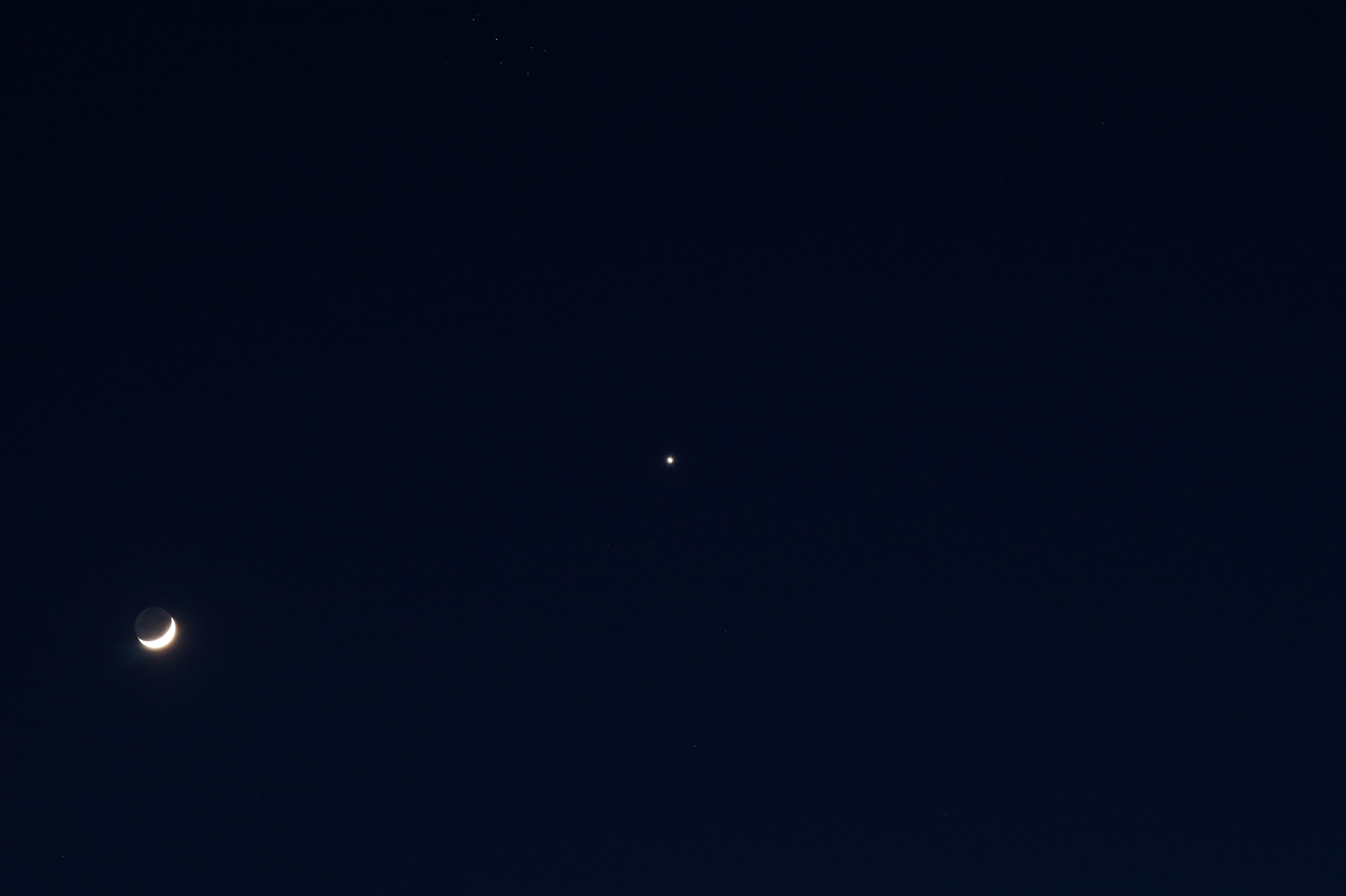 Mitte: Venus. Der Planet zeigt sich als weißes Scheibchen.