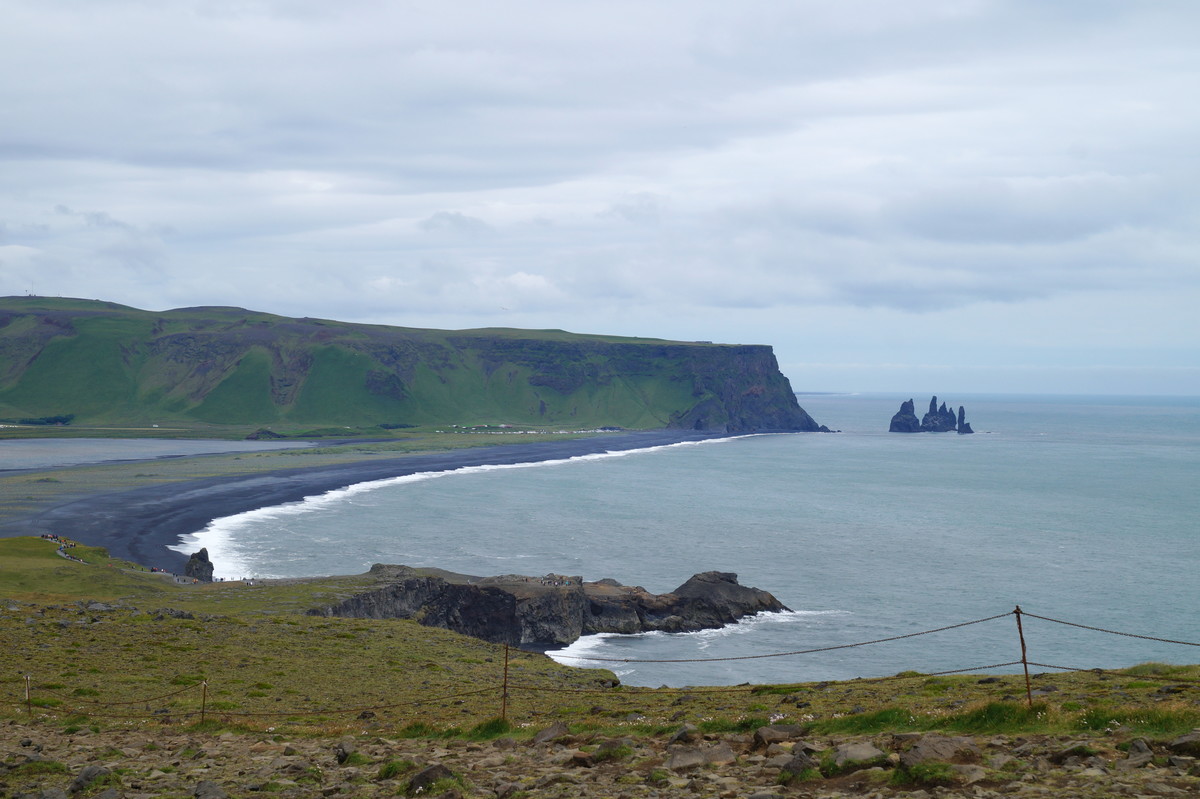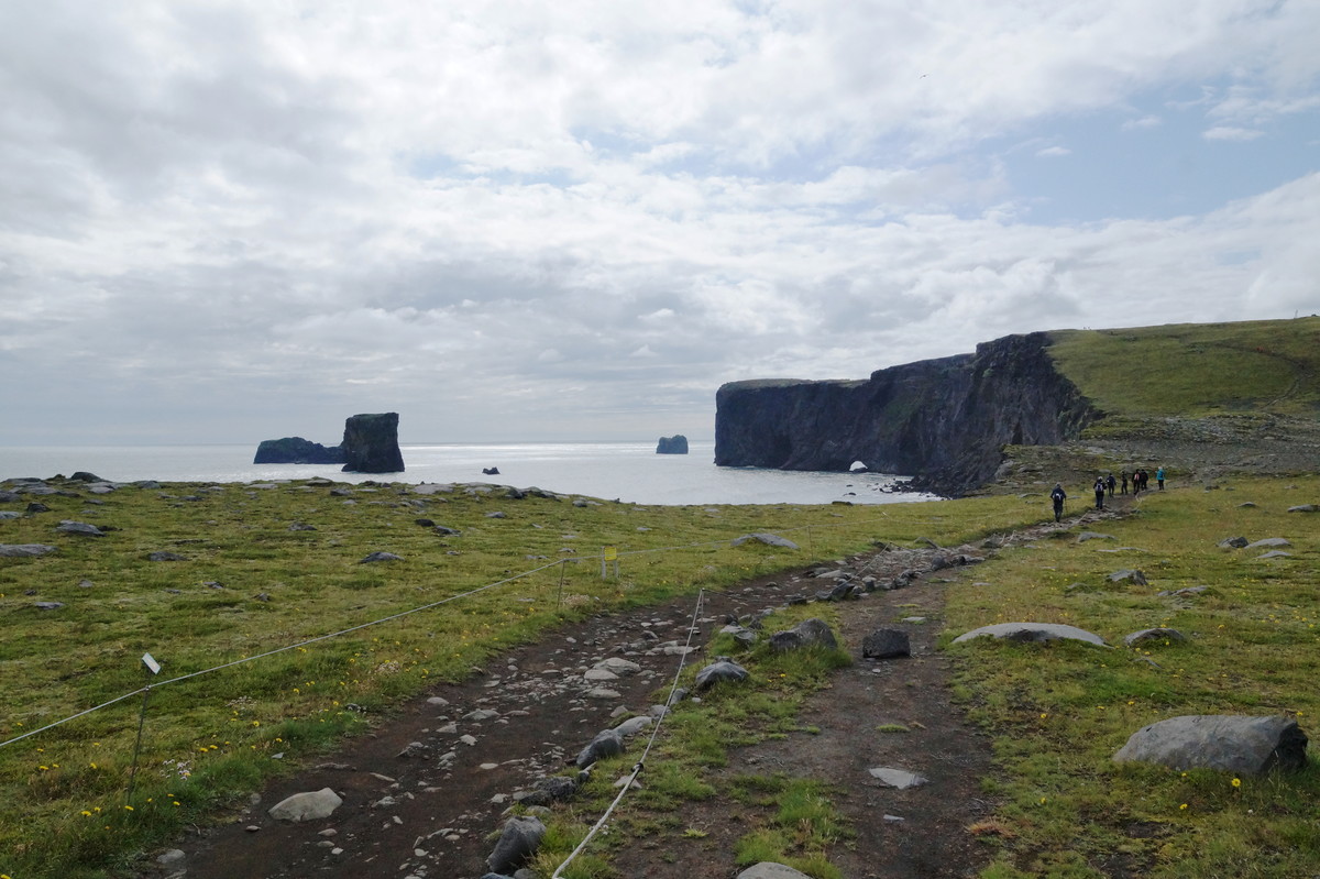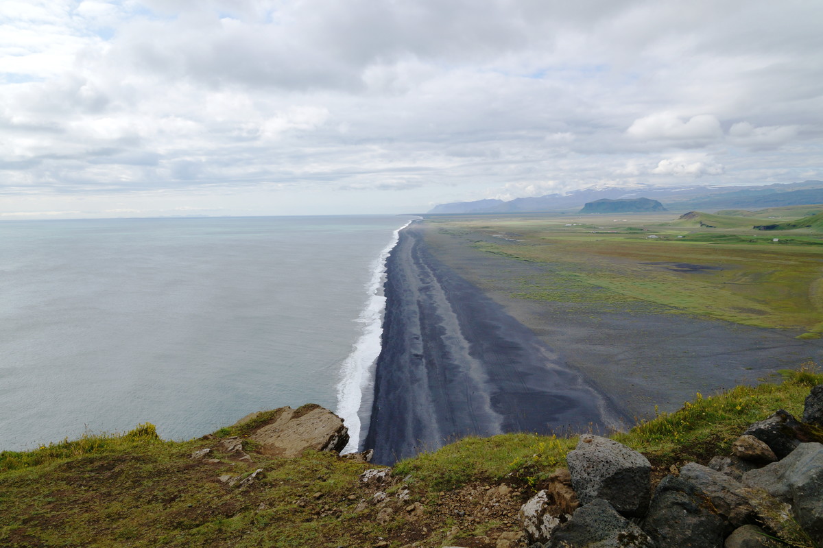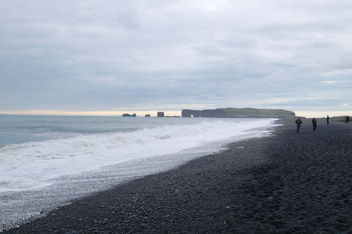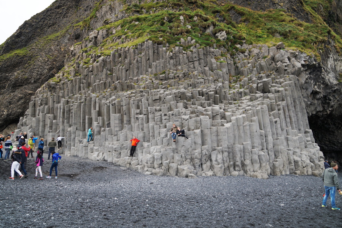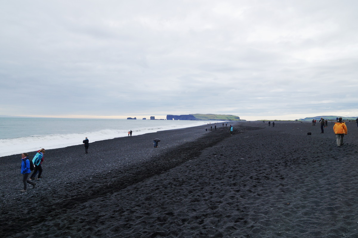 Die Fahrt geht weiter der Küste entlang, über zahllose weit ausgestreckte Sander (Lava-Sandfelder, Schotterebenen). Wir treffen an einer besonders eindrucksvollen Bucht ein, der Dyrhólaey ("Tür-Loch-Insel"). Dort finden sich schroffe Felsen, endlose Blicke über die Küste, aber auch Papageitaucher en masse. Wir fahren mit dem Bus um die Lagune herum zum Reynisfjall, an dessen Fuß sich eine Wand aus Basaltsäulen auftürmt. Der Sand ist völlig schwarz hier. Wieder geht es weiter, diesmal zum Hótel Búrfell in Steig, ein paar Kilometer die Straße zurück.