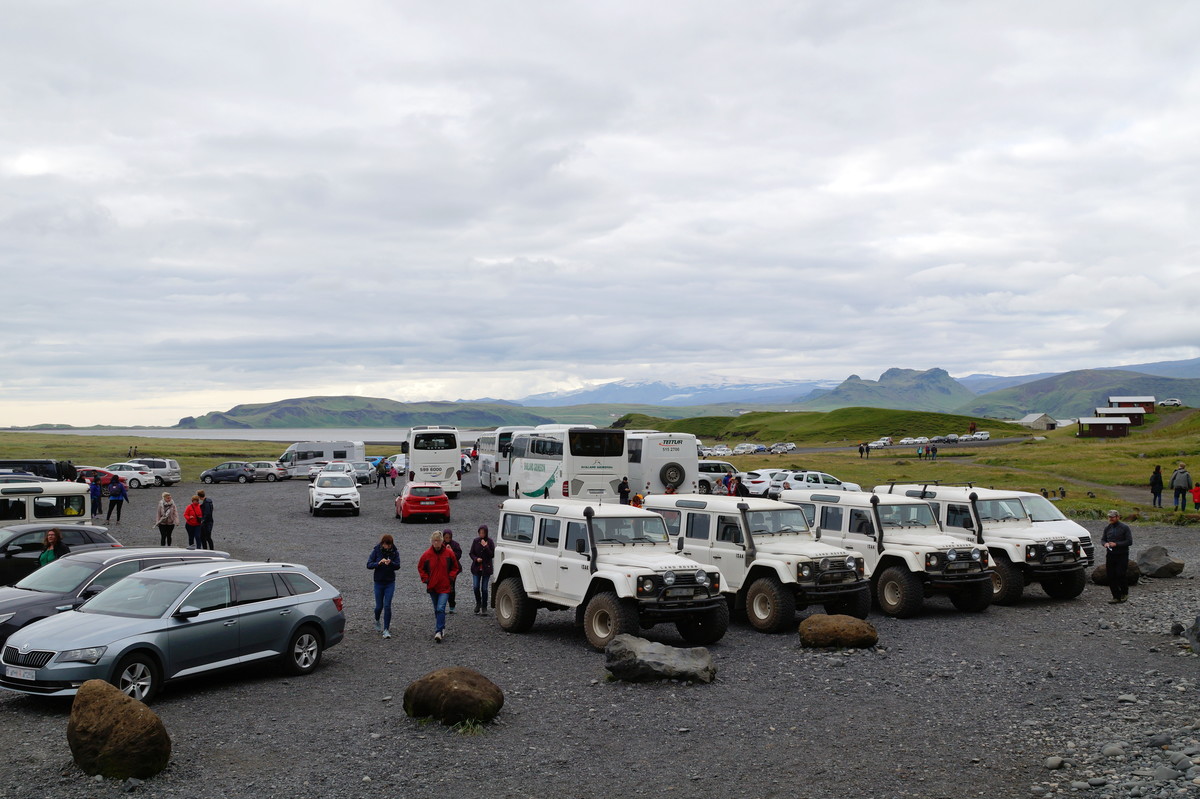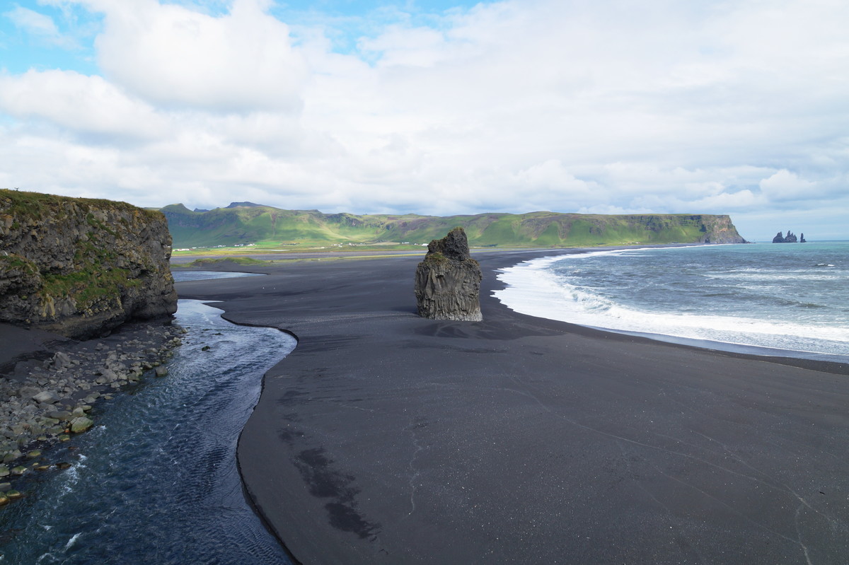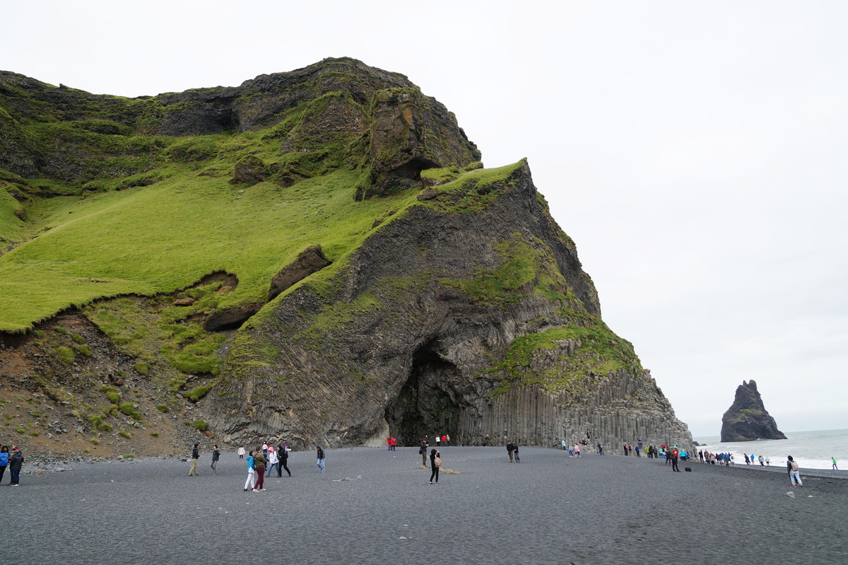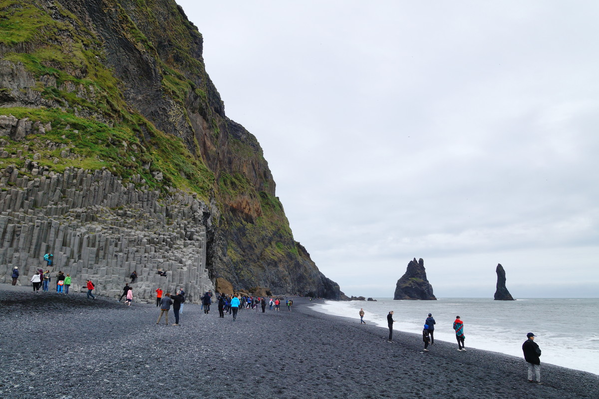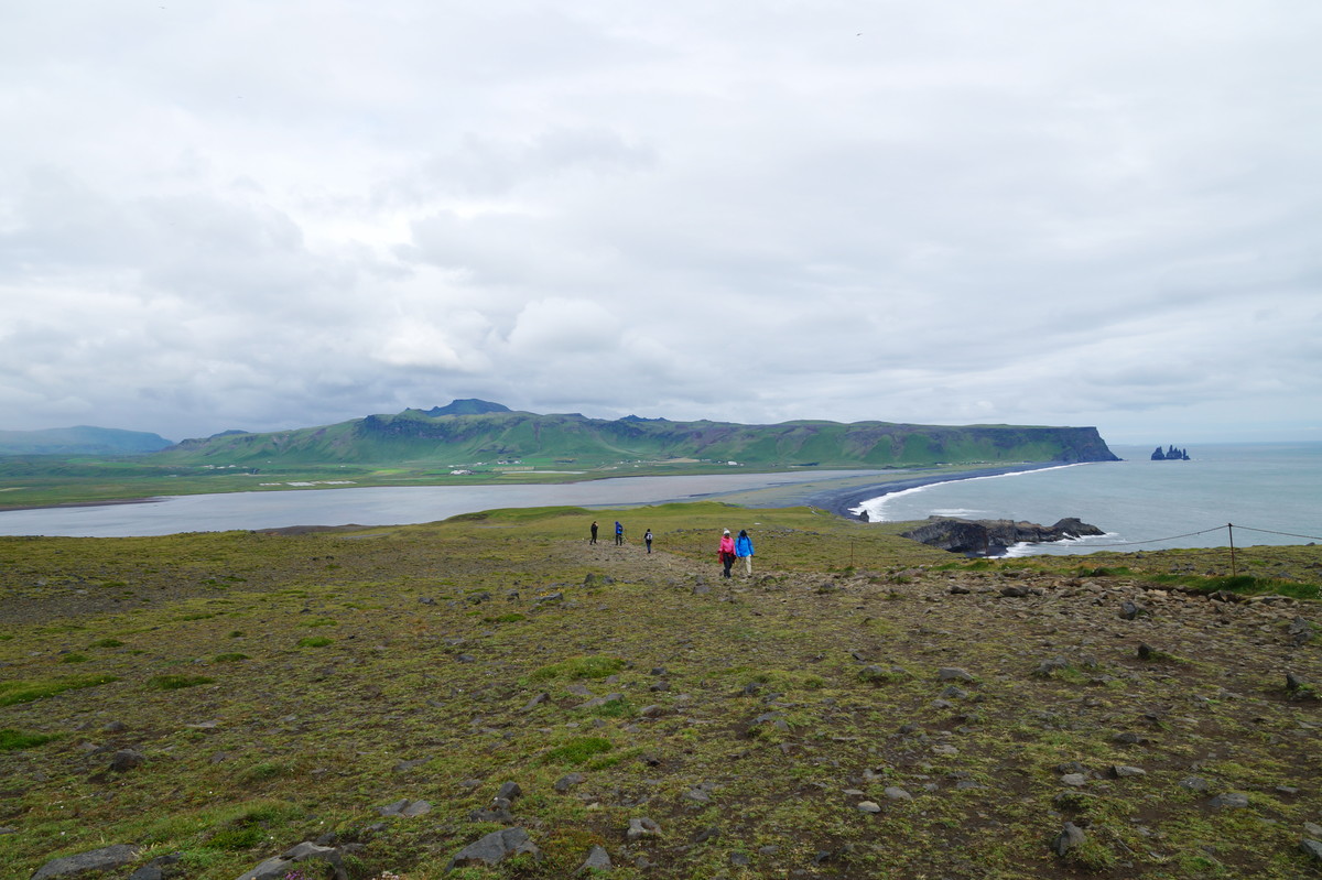 Die Fahrt geht weiter der Küste entlang, über zahllose weit ausgestreckte Sander (Lava-Sandfelder, Schotterebenen). Wir treffen an einer besonders eindrucksvollen Bucht ein, der Dyrhólaey ("Tür-Loch-Insel"). Dort finden sich schroffe Felsen, endlose Blicke über die Küste, aber auch Papageitaucher en masse. Wir fahren mit dem Bus um die Lagune herum zum Reynisfjall, an dessen Fuß sich eine Wand aus Basaltsäulen auftürmt. Der Sand ist völlig schwarz hier. Wieder geht es weiter, diesmal zum Hótel Búrfell in Steig, ein paar Kilometer die Straße zurück.