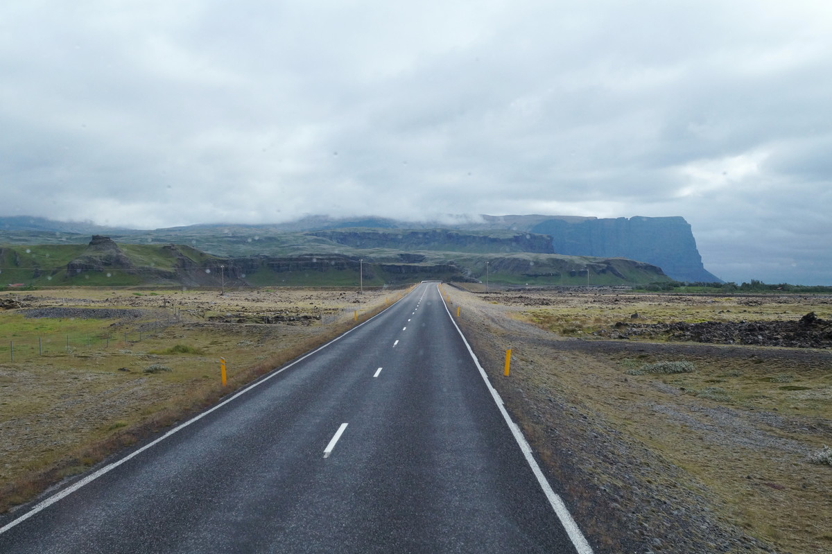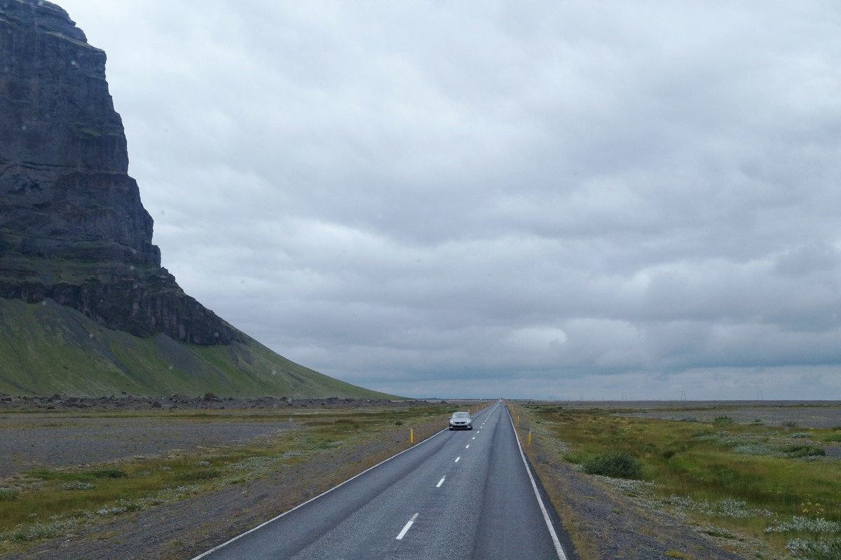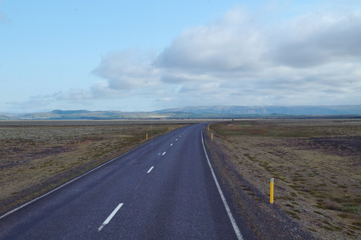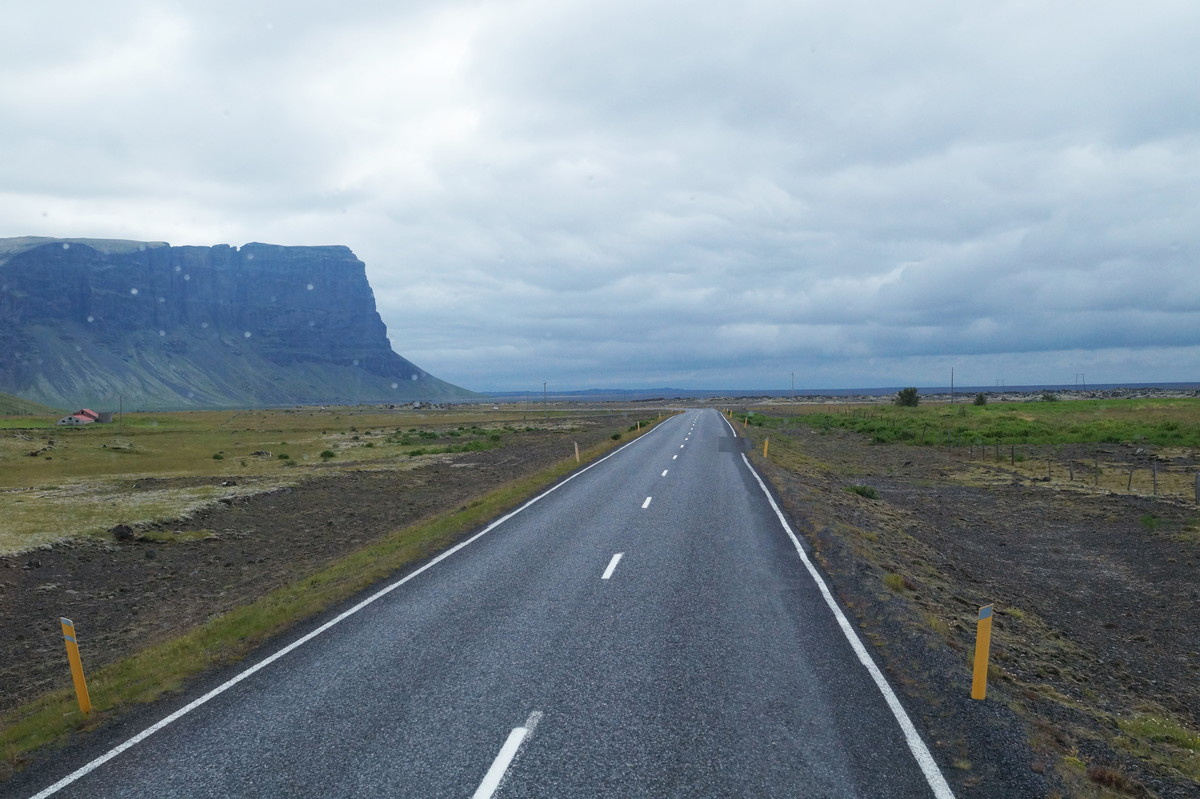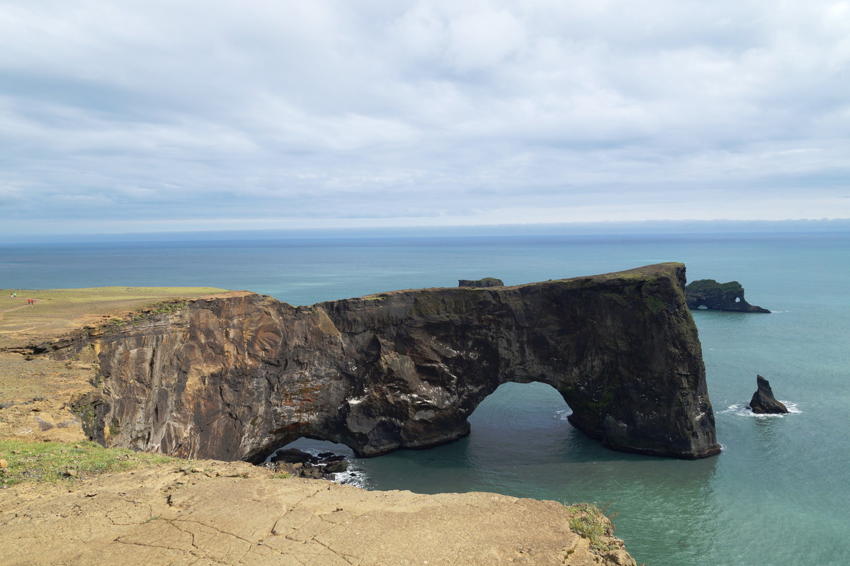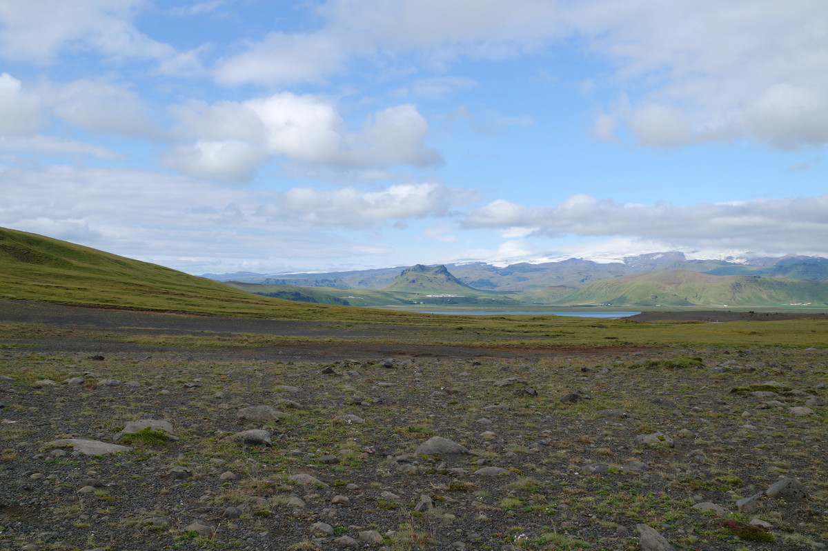 Die Fahrt geht weiter der Küste entlang, über zahllose weit ausgestreckte Sander (Lava-Sandfelder, Schotterebenen). Wir treffen an einer besonders eindrucksvollen Bucht ein, der Dyrhólaey ("Tür-Loch-Insel"). Dort finden sich schroffe Felsen, endlose Blicke über die Küste, aber auch Papageitaucher en masse. Wir fahren mit dem Bus um die Lagune herum zum Reynisfjall, an dessen Fuß sich eine Wand aus Basaltsäulen auftürmt. Der Sand ist völlig schwarz hier. Wieder geht es weiter, diesmal zum Hótel Búrfell in Steig, ein paar Kilometer die Straße zurück.