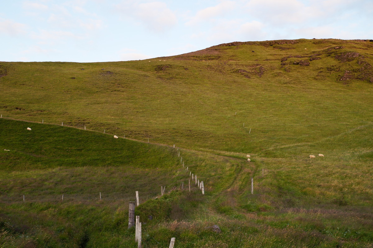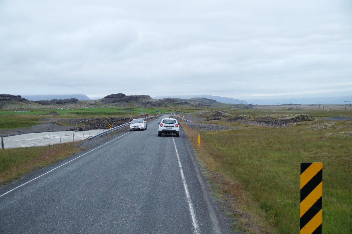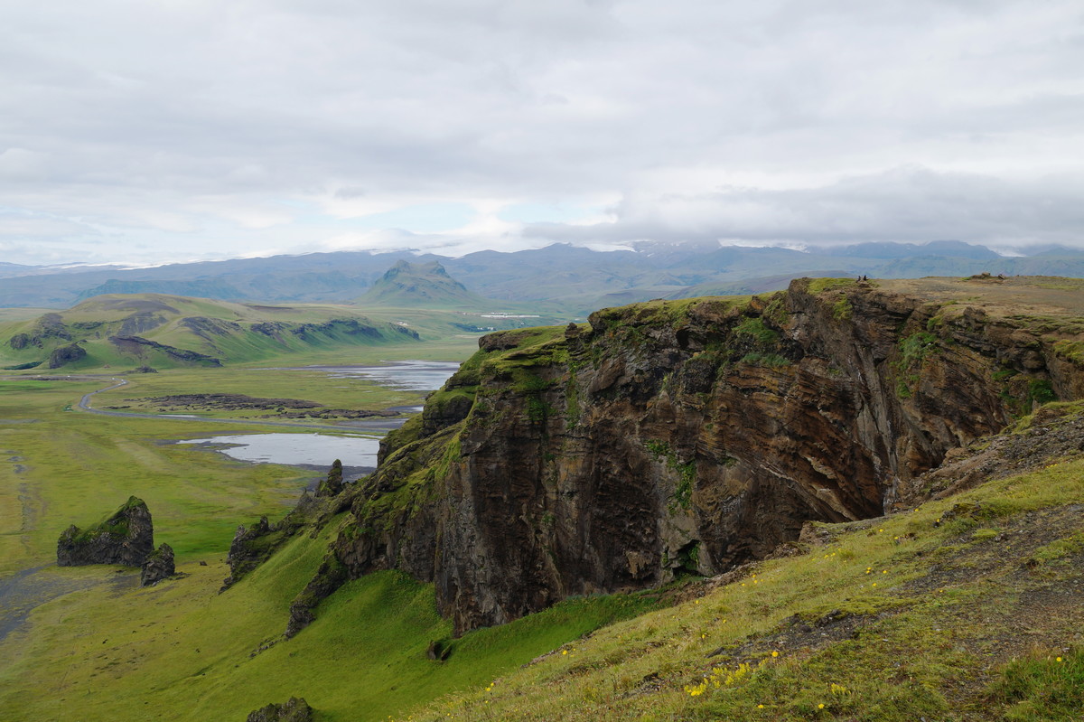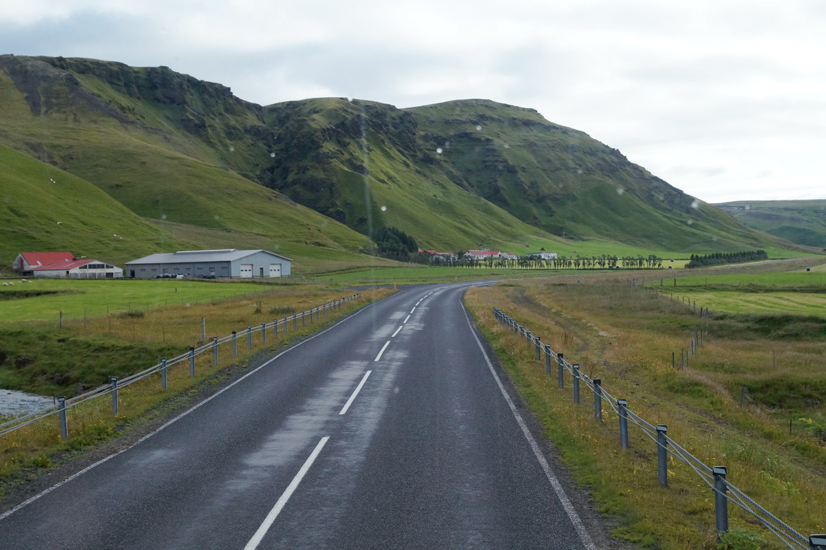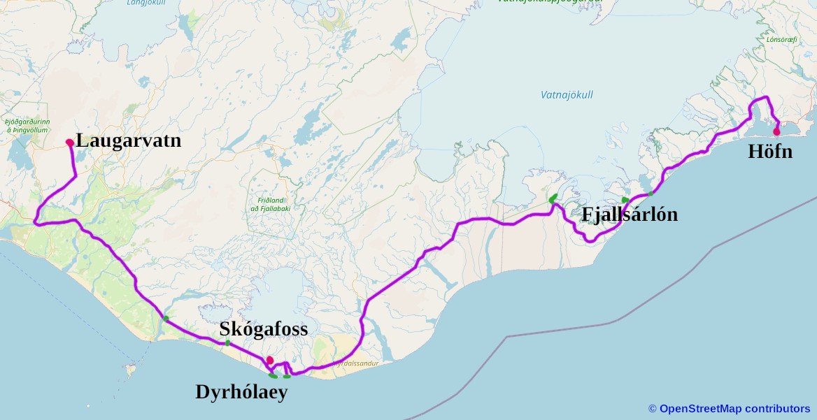 Die Fahrt geht weiter der Küste entlang, über zahllose weit ausgestreckte Sander (Lava-Sandfelder, Schotterebenen). Wir treffen an einer besonders eindrucksvollen Bucht ein, der Dyrhólaey ("Tür-Loch-Insel"). Dort finden sich schroffe Felsen, endlose Blicke über die Küste, aber auch Papageitaucher en masse. Wir fahren mit dem Bus um die Lagune herum zum Reynisfjall, an dessen Fuß sich eine Wand aus Basaltsäulen auftürmt. Der Sand ist völlig schwarz hier. Wieder geht es weiter, diesmal zum Hótel Búrfell in Steig, ein paar Kilometer die Straße zurück.