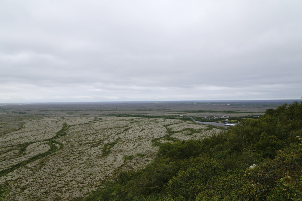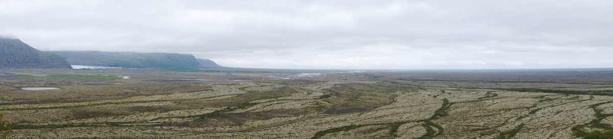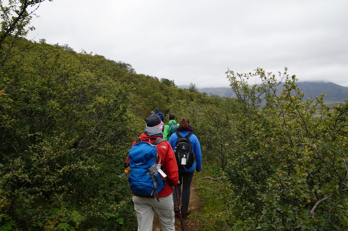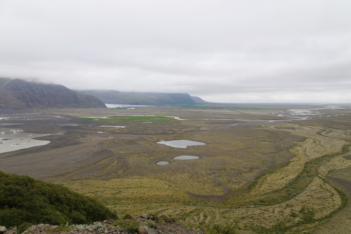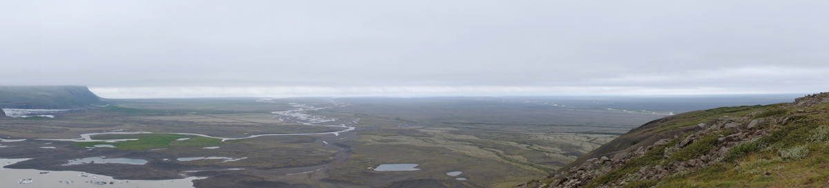 Von hier aus geht es am nächsten Tag weiter, wieder über Sander, kurze Rast in Kirkubæjarsklaustur, dann treffen wir an unserem nächsten Wanderpunkt ein. Unser Ziel sind jedoch nicht die Wasserfälle wie Svartifoss und Hundafoss, sondern der Blick auf den Gletscherausläufer Skaftafellsjökull. Er gehört letztlich zum riesigen Vatnajökull. Wir wandern etwas über eine Stunde auf den Bergrücken hinauf, machen ein ausgiebiges Picknick mit Blick auf den Gletscher, wandern dann wieder hinunter zum Bus.