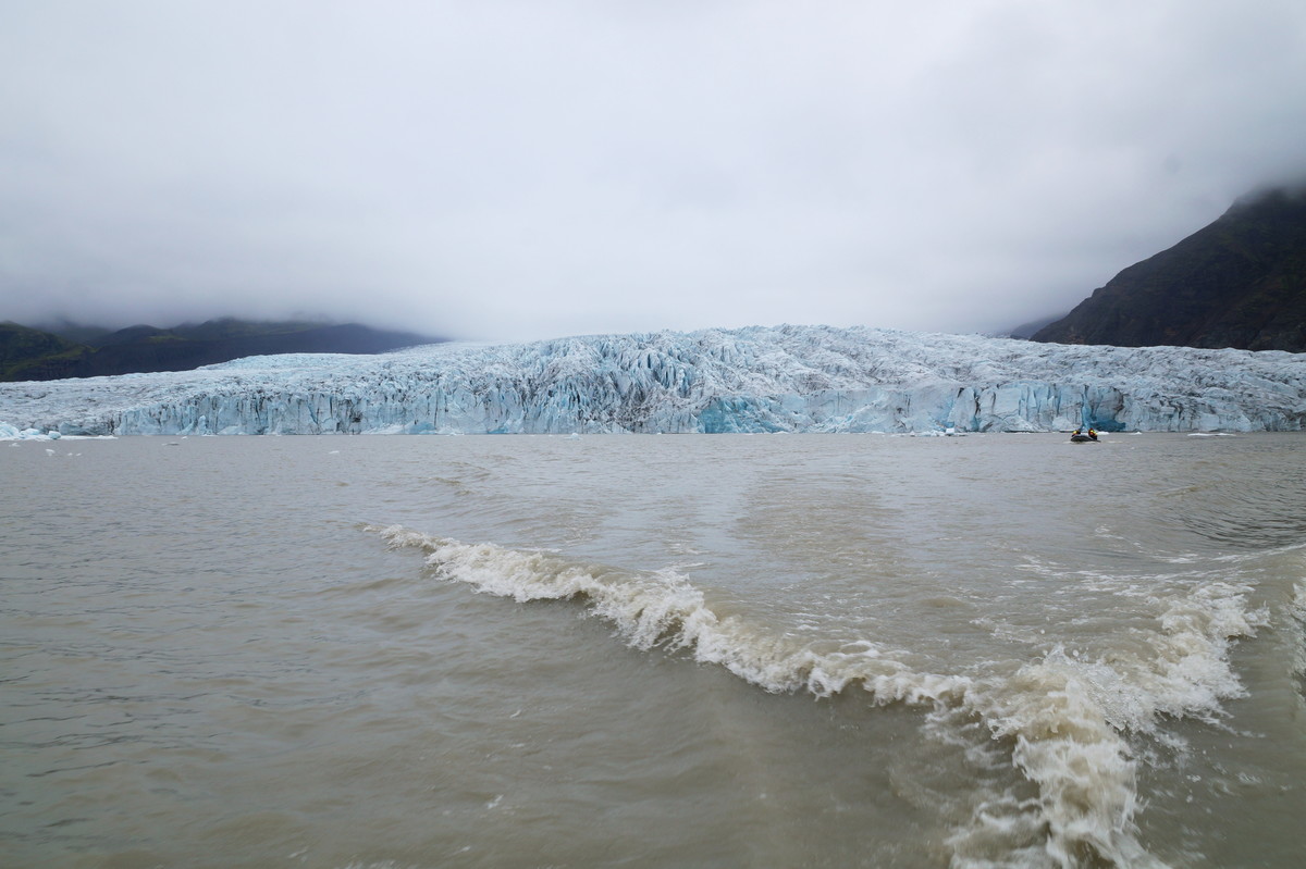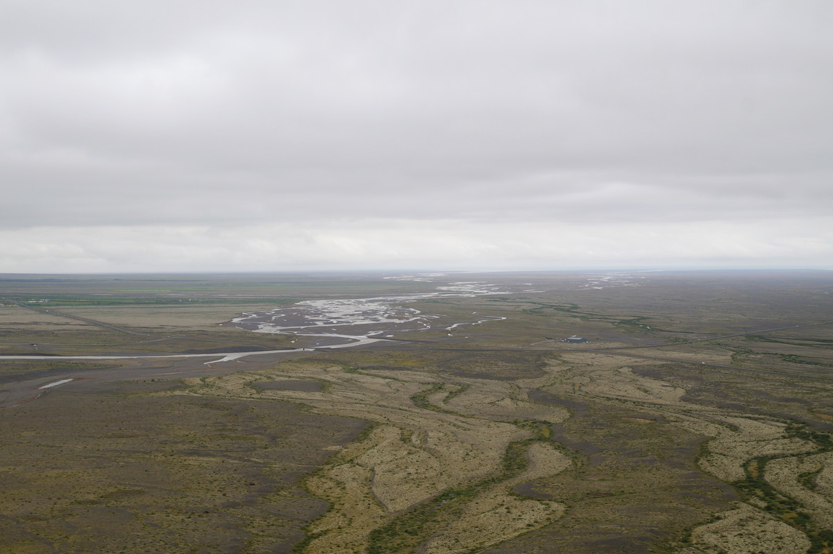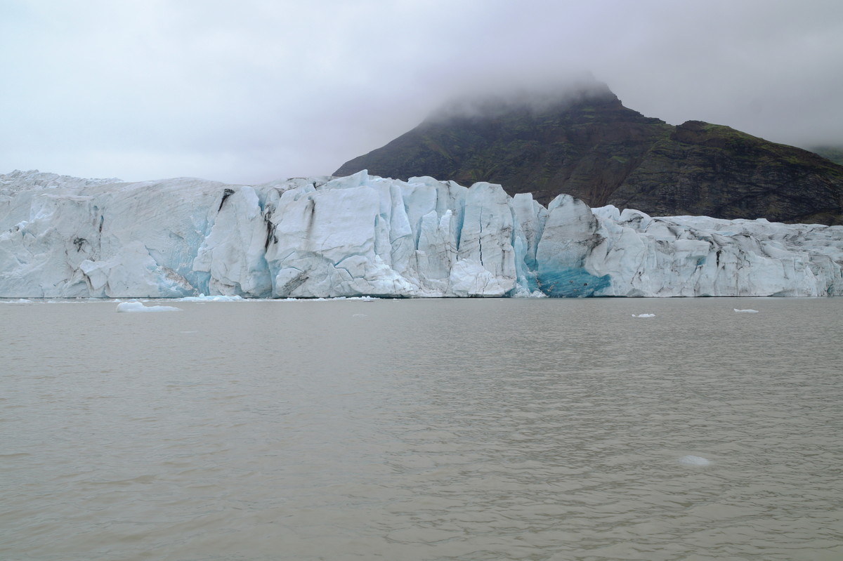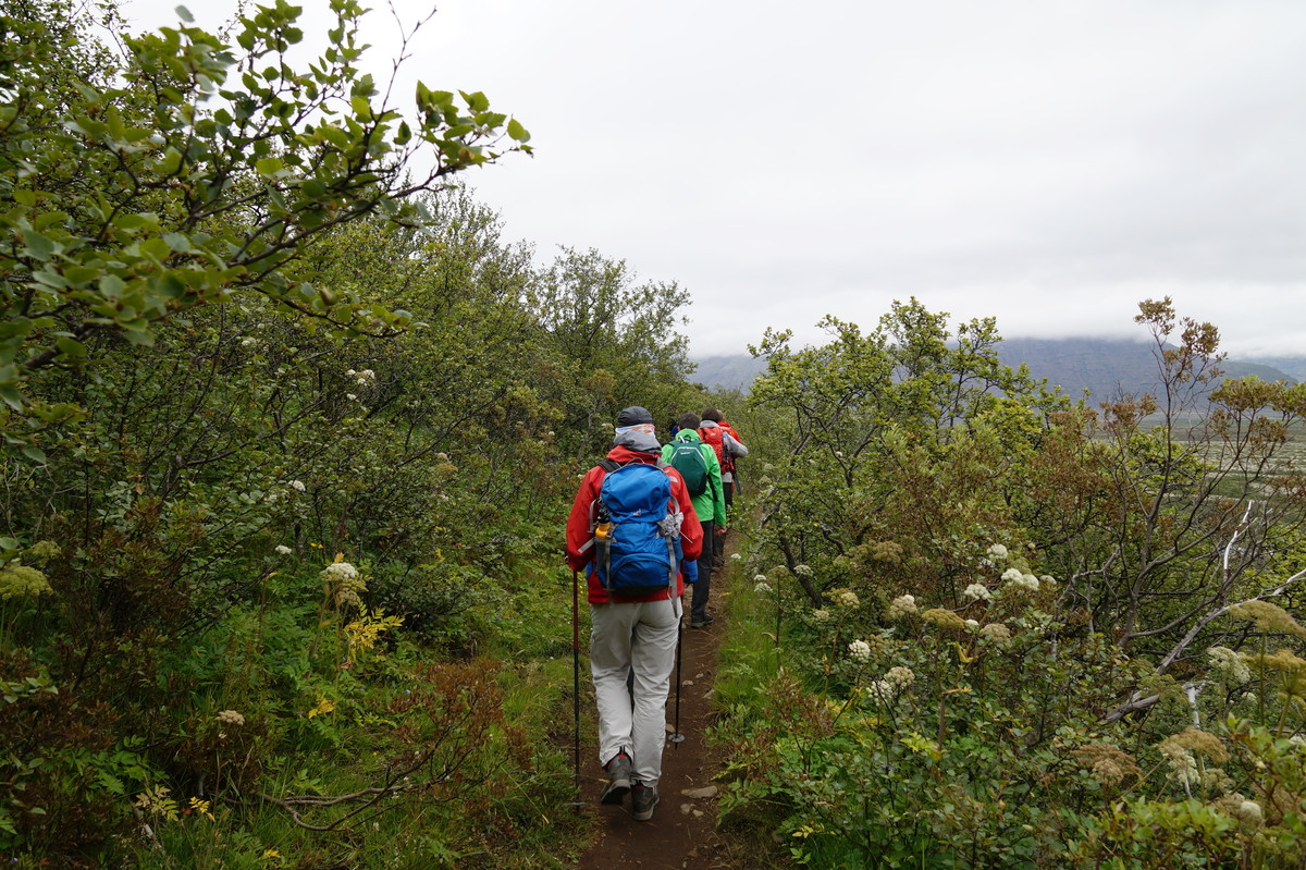 Von hier aus geht es am nächsten Tag weiter, wieder über Sander, kurze Rast in Kirkubæjarsklaustur, dann treffen wir an unserem nächsten Wanderpunkt ein. Unser Ziel sind jedoch nicht die Wasserfälle wie Svartifoss und Hundafoss, sondern der Blick auf den Gletscherausläufer Skaftafellsjökull. Er gehört letztlich zum riesigen Vatnajökull. Wir wandern etwas über eine Stunde auf den Bergrücken hinauf, machen ein ausgiebiges Picknick mit Blick auf den Gletscher, wandern dann wieder hinunter zum Bus.