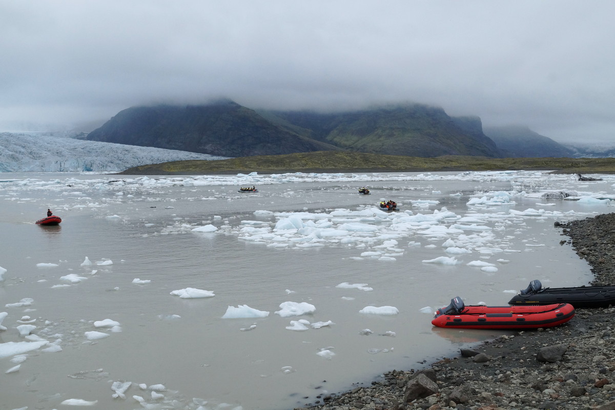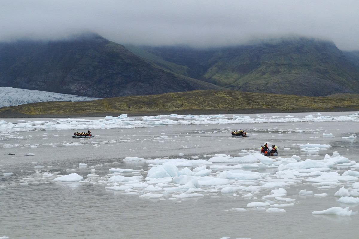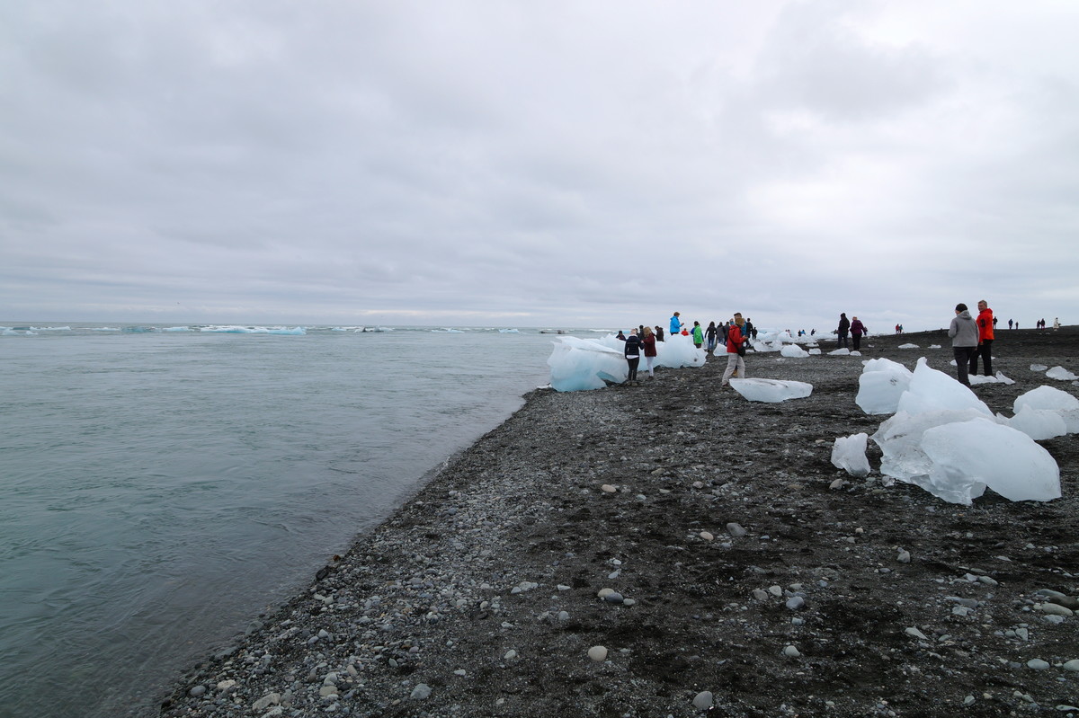 Nächster Stopp ist die Gletscherlagune Fjallsárlón. Mit Schlauchbooten lassen wir uns über die Lagune fahren und schauen uns das Ende des mächtigen Fjallsjökull an. Auf einmal gibt es einen Knall, und ein Stück des Gletschers bricht ab und fällt nicht weit vor uns in die Lagune. Nach diesem Erlebnis machen wir an der Mündung des Jökulsárlón noch einmal Halt und beobachten, wie kleine Eisberge ins Meer gespült werden. Interessant: Die Lagune ist im James-Bond-Film "Stirb an einem anderen Tag" zu sehen; man ließ sie zufrieren, indem der Ausfluss blockiert wurde.