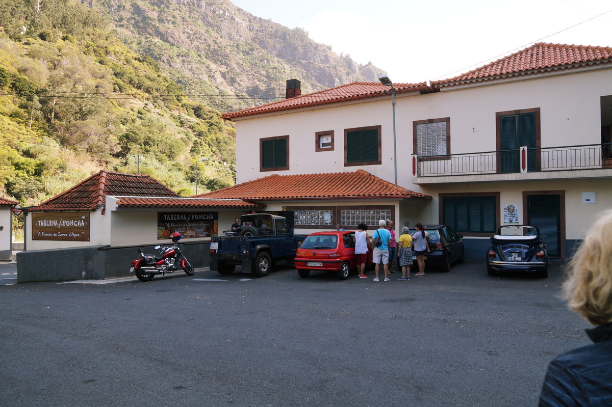Danach geht es wieder zurück; wir halten an einem bekannten Wasserfall, dem Brautschleier (Véu da Noiva) und genehmigen uns einen Drink an der Taberna da Poncha.