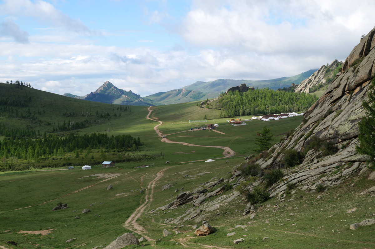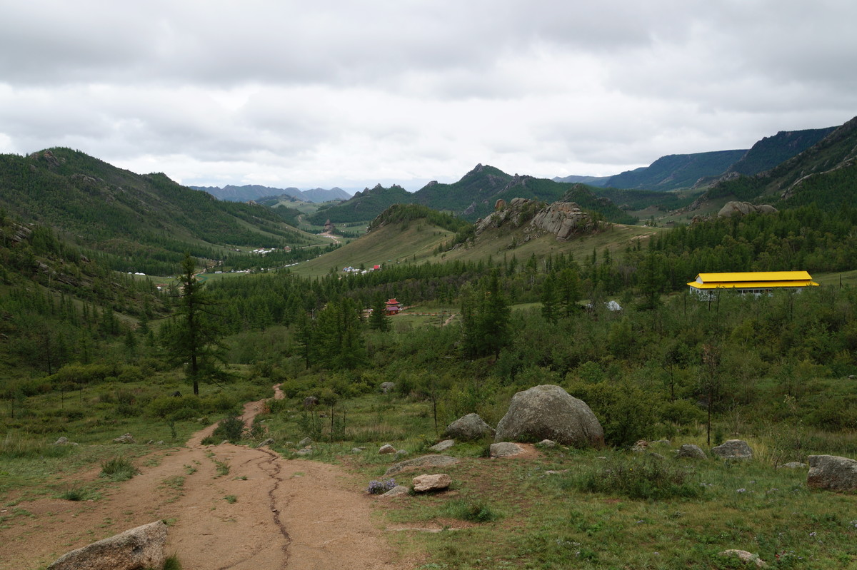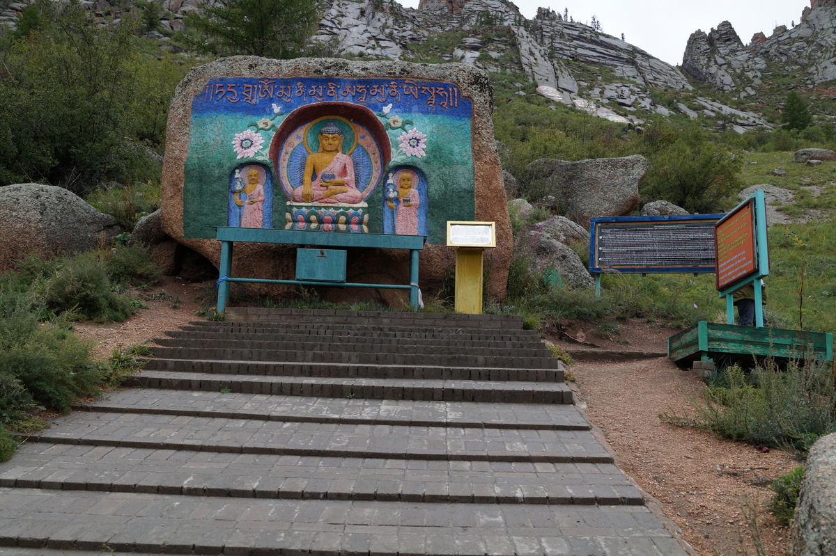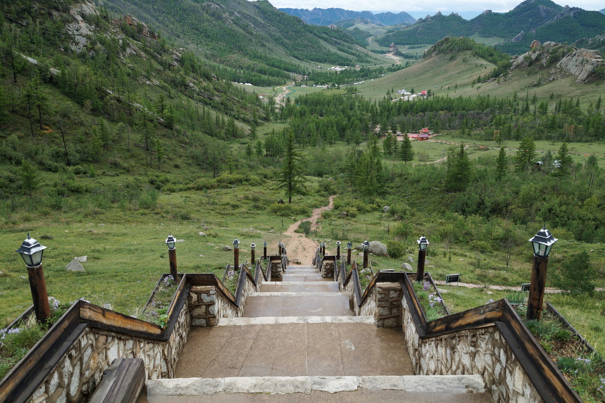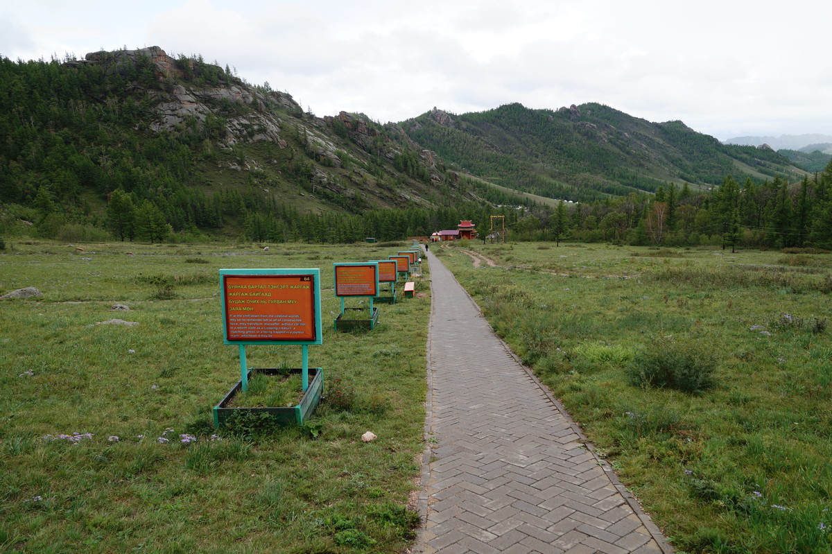Khan-Khentii-Nationalpark (Töv). Wir erreichen den Khan-Khentii-Nationalpark und treffen auf das Dschingis-Khan-Museum samt riesigem Reiterdenkmal. Dies hier soll der Geburtsort des Mongolenherrschers gewesen sein. Was das Ganze etwas weniger monumental macht, ist, dass die Anlage erst im Jahre 2007 gebaut wurde. Moderne Geschichte. Am Schildkrötenfelsen vorbei geht es zum Meditationszentrum Aryabal. Dort hat man einen wirklich erhabenen Ausblick auf die Landschaft.