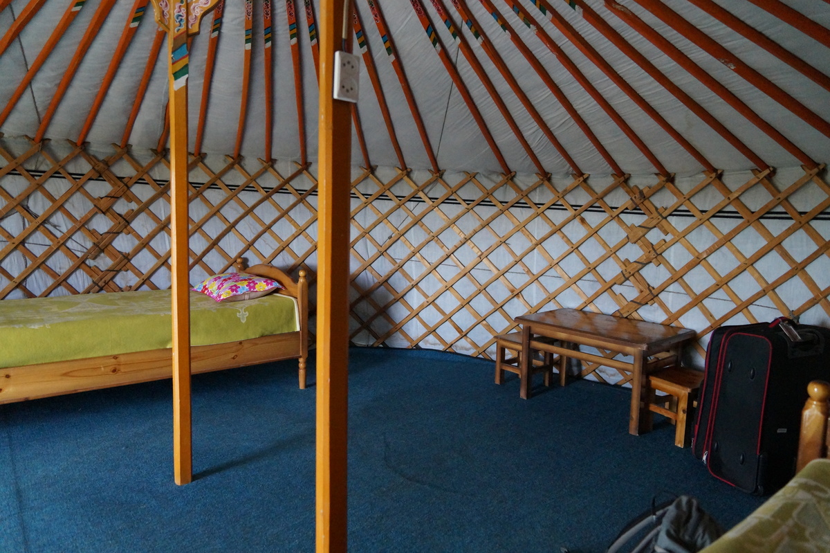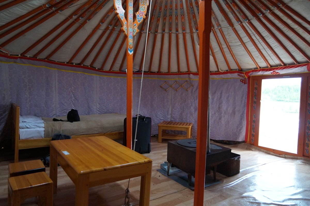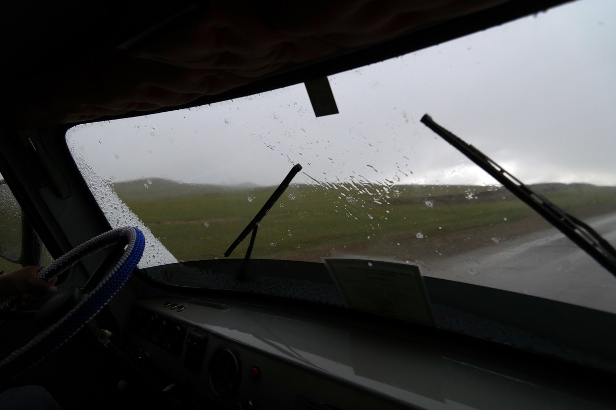 Überraschung: Die Jurte sieht so leer aus - es ist kein Ofen vorhanden, aber es ist August, was kann passieren ... Na ja, etwa, dass es morgens 11 Grad in meiner Jurte hat. Weiter geht es schnell Richtung Ulaanbaatar, und das Wetter wird auch schnell unangenehmer. Es fängt an zu graupeln, auf der Scheibe sammelt sich sogar Eis.