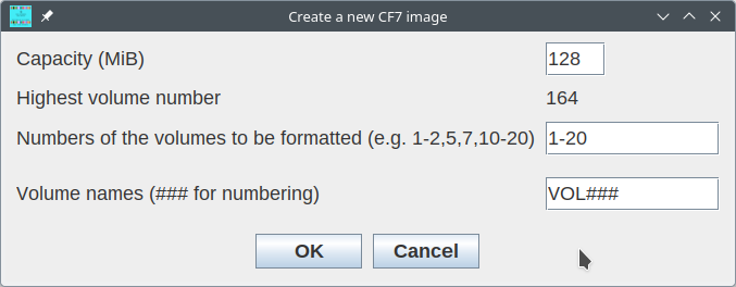 The CF7 image consists of equally-sized volumes of 400 KiB each. Logically, the volumes resemble floppy disks with 1600 sectors each. You can define as many volumes as fit on a CF7 image of the given size; after you specify the full capacity, the number of volumes is computed from it.