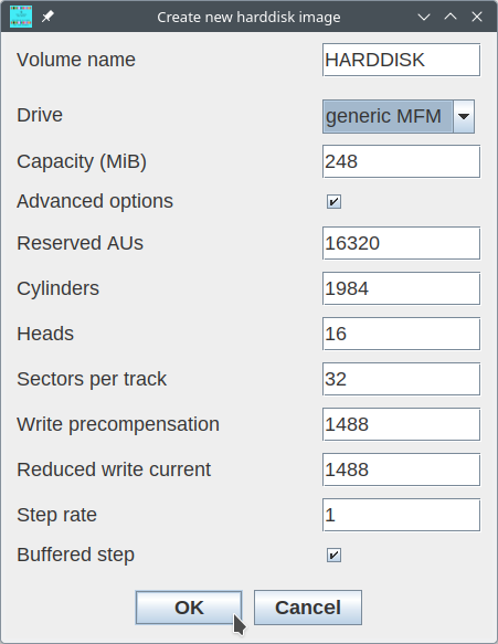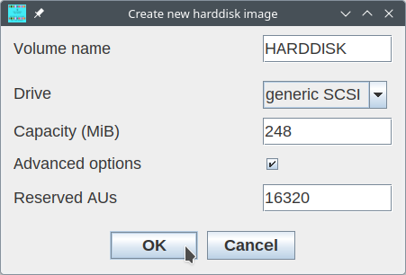 For SCSI we do not have special types, so the option to choose is "generic SCSI". You can specify the size of the volume up to 248 MiB; this is an upper limit imposed by the TI hard disk file system. The only advanced option is the number of reserved allocation units (AUs).