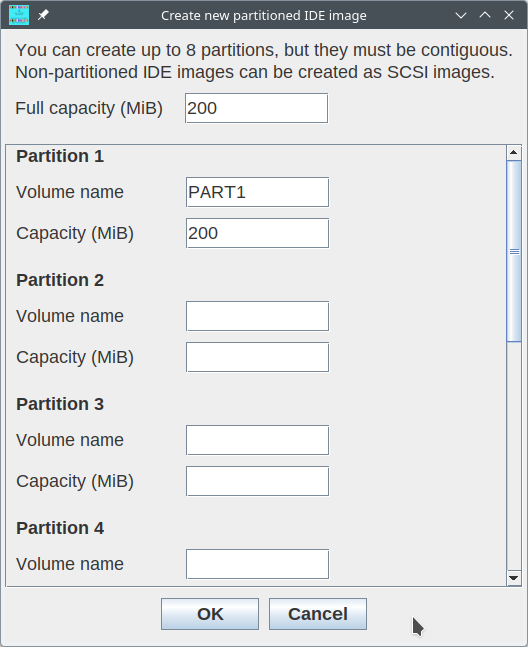 You have to provide the overall capacity of the IDE image (across all partitions). As we can define up to 8 partitions (with IDE DSR v15), the maximum usable size is 8*248 MiB = 1984 MiB.