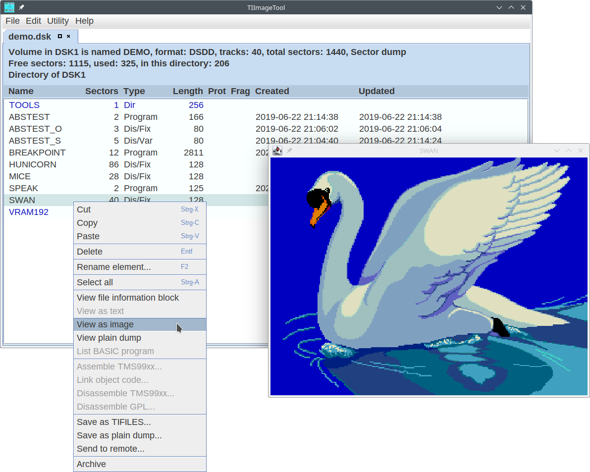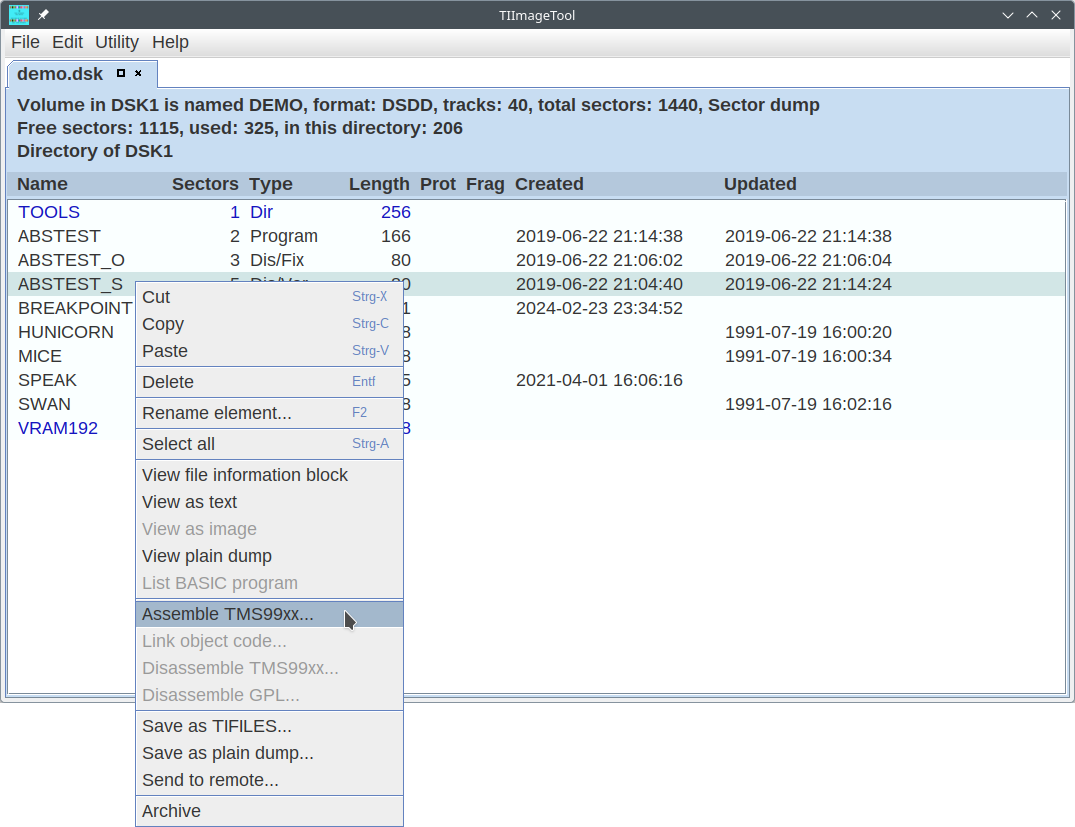 There are two kinds on menus in TIImageTool: the dropdown menus from the menu line, and the context menu. The selectable actions of the context menu depend on the file where the menu has been opened. Also, you can open a context menu below the file listing in order to operate on the volume itself, like for creating new files and directories.