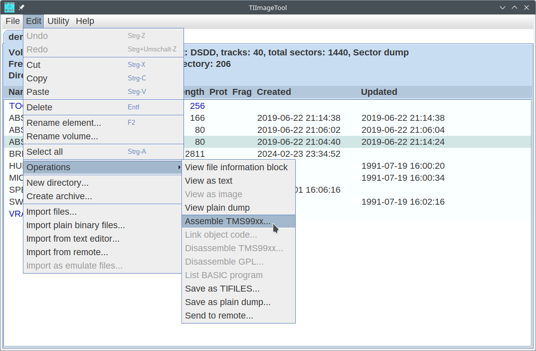 Available operations depend on the selected entries. For instance, if you select multiple text files you can open each one of them in one go. If you select a BASIC file and a text file together, however, there are less options because you cannot treat a text file like a BASIC file. The program determines which options may be reasonable to use for the current selection.