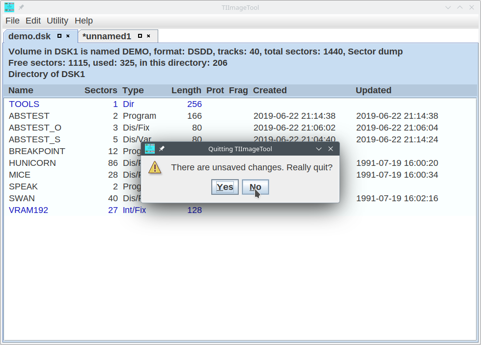 This is one of the most salient changes to TIImageTool from the previous versions to version 3: All operations are done in memory, not on the image file. That is, when you copy or move a file, the change is immediately visible in the views, but the change is not yet persistent, and the image file has not been changed yet. If there was a change, an asterisk (*) is put before the image name in the tab. When you attempt to close the image or to leave TIImageTool, you will be warned to save your changes.timt quit